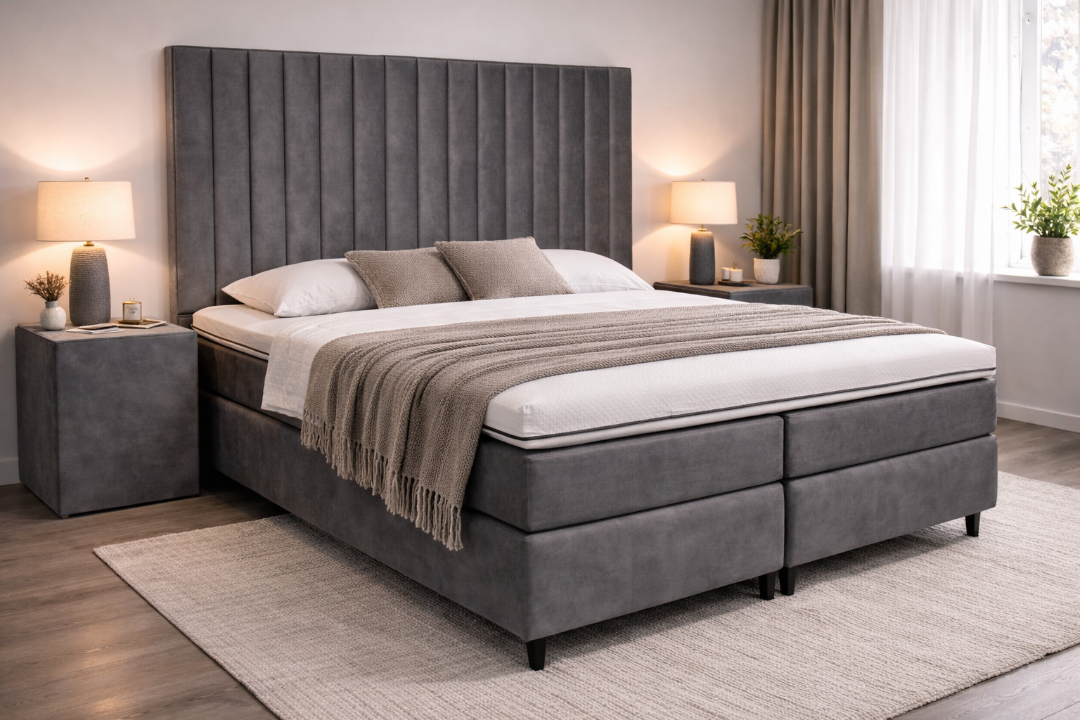 De Boxspring Retro XL – Grijs combineert moderne luxe met een verfijnde retro-uitstraling. Dit model is uitgevoerd in een zachte, luxe fluweelstof in een diepe middengrijze tint en vormt een elegante blikvanger in iedere slaapkamer. Dankzij het imposante XL-hoofdbord met verticale banen straalt deze boxspring rust, symmetrie en hotel-chique luxe uit.