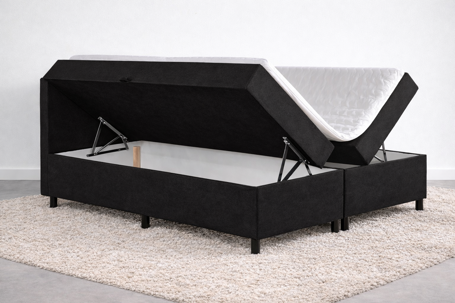 Dankzij de slimme constructie beschikt de boxspring over opbergruimte in de onderboxen die aan beide zijkanten geopend kunnen worden. Hierdoor benut je de ruimte onder het bed optimaal. Ideaal voor het opbergen van dekbedden, kussens, kleding of seizoensbeddengoed.